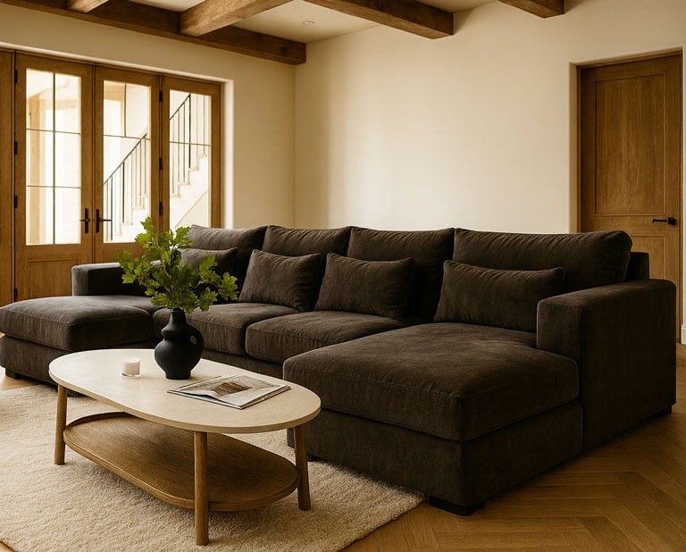 A mix of old and new. These designs blend the structure of traditional pieces with the softness and ease of modern living — especially when styled as one of the best customizable sectional sofas or best custom sectional sofas with plush seating and neutral tones.
